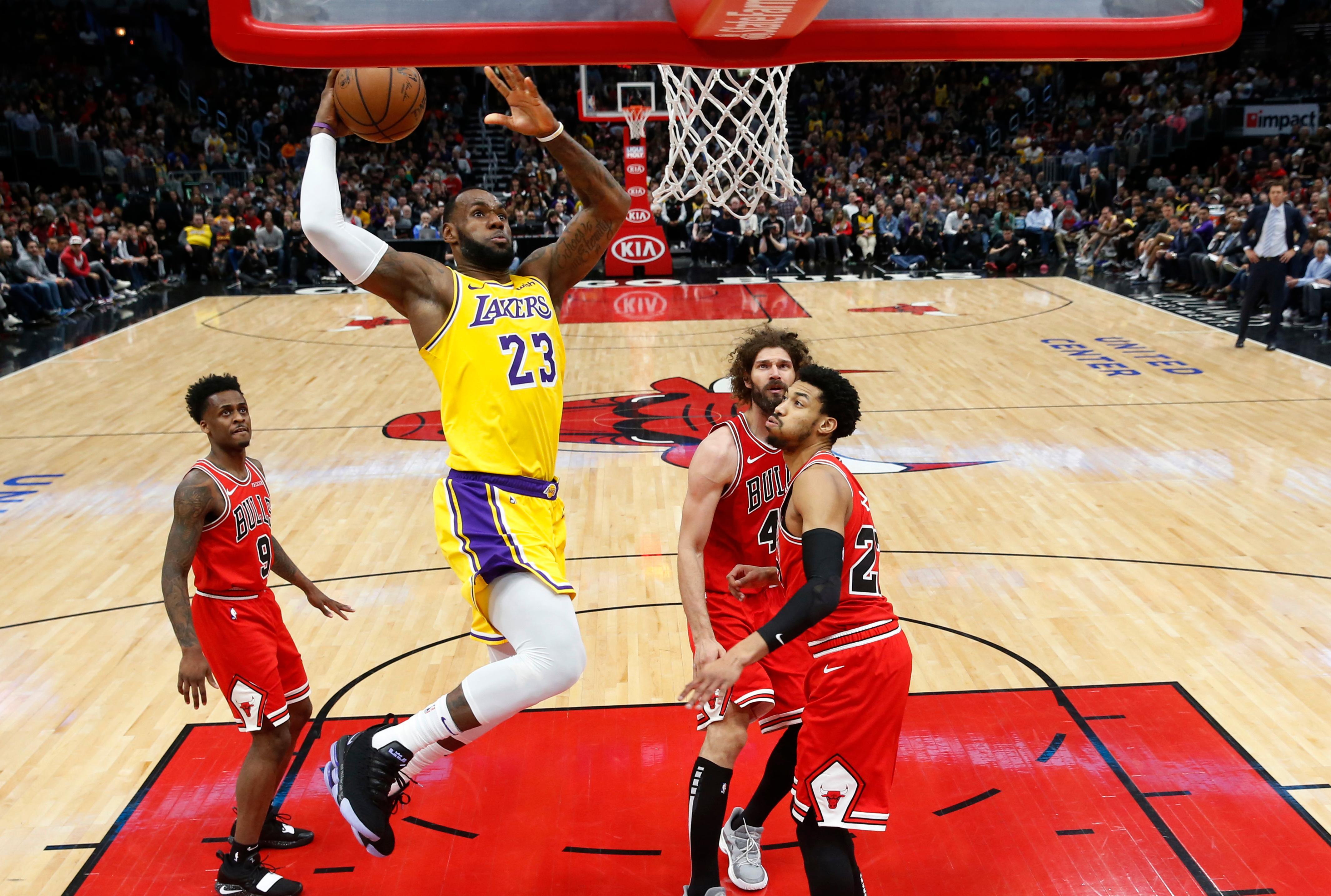 Lebron james got his los angeles lakers career started in stunning style with an incredible dunk for his first bucket.